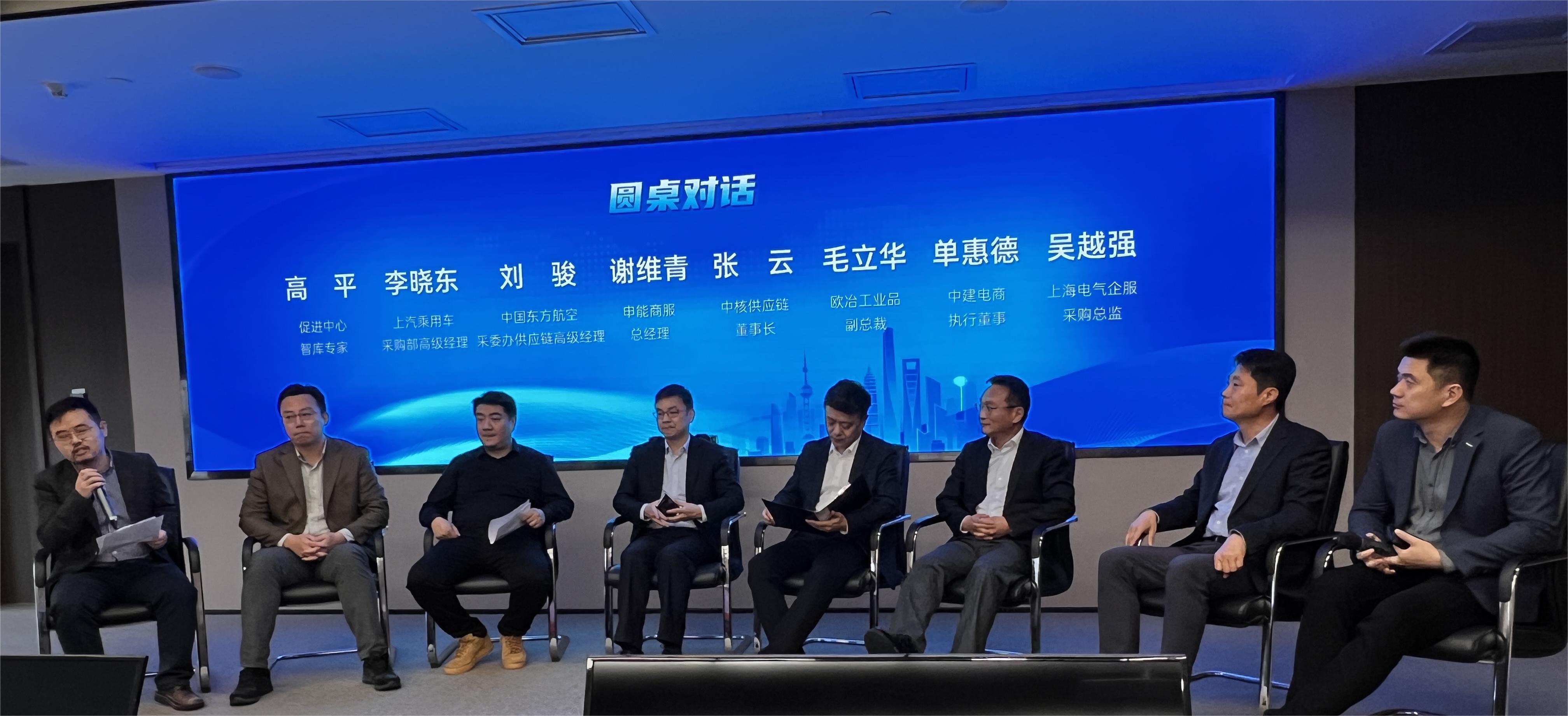 在圆桌交流环节,中核供应链董事长张云、申能商务总经理谢维青、上海中建电商执行董事单惠德、欧冶工业品副总裁毛立华、东航集团采委办供应链分部高级经理刘骏、上海电气企服公司采购总监吴越强、上汽乘用车采购部高级经理李晓东围绕数字化供应链、产业互联网与新质生产力展开了热烈地探讨。圆桌交流环节由上海长三角产业互联网促进中心智库专家高平博士主持。
