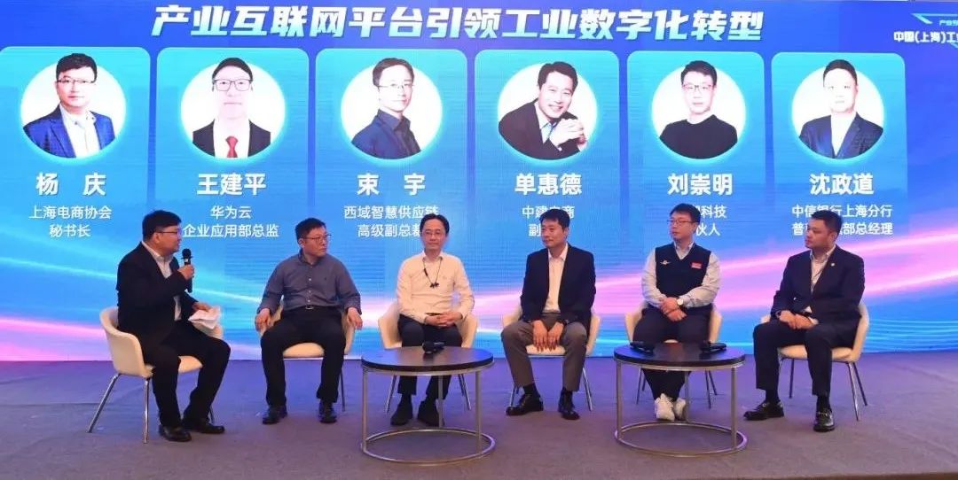 在圆桌论坛环节,中建电商副总裁单惠德、西域智慧供应链高级副总裁束宇、中信银行上海分行普惠金融部总经理沈政道、上海黑湖科技合伙人刘崇明、华为云企业应用部总监王建平围绕“产业互联网平台引领工业数字化转型”话题展开了热烈地讨论与交流。