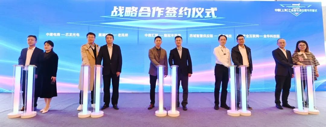 在战略合作签约环节,中建电商云筑与芯龙光电在平台赋能品牌宣传并实施照明灯具产品定制化推广方面达成战略合作;中微汇链与隐冠半导体将合作实施半导体关键零部件的企业数字化项目;黑湖科技将为老凤祥打造数据驱动的金饰珠宝行业柔性供应链,让传统技艺更好地满足消费者的个性化需求;西域智慧供应链与热像科技在产品技术创新、市场推广等方面达成深度合作;上海产业互联网有限公司与金华科技园将合作组织“平台+园区”专场活动,助力上海数智化服务走出去服务长三角。