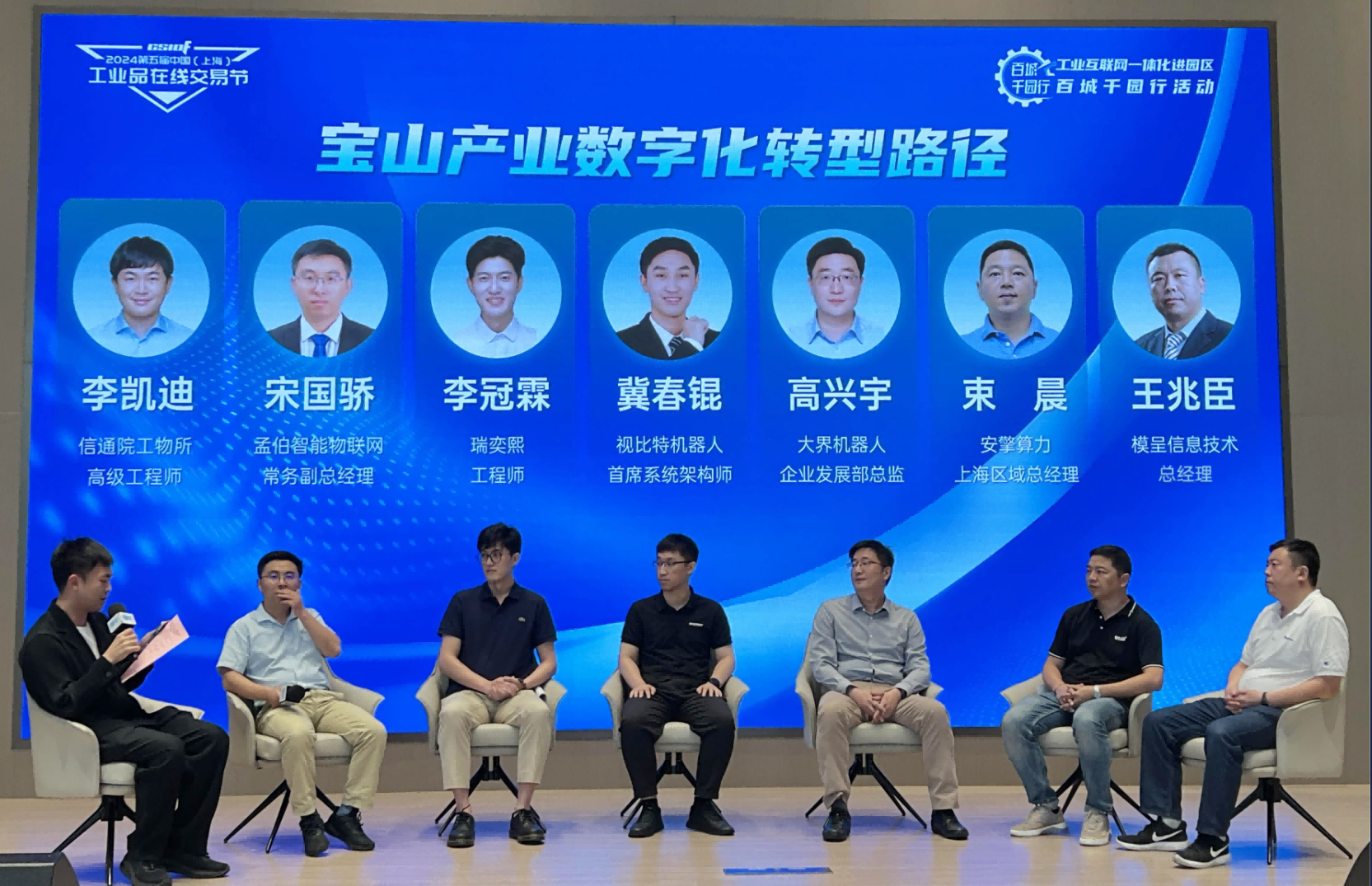 圆桌论坛环节上,上海孟伯智能物联网科技有限公司常务副总经理宋国骄、瑞奕熙(上海)智能科技有限公司工程师李冠霖、视比特(上海)机器人科技有限公司首席系统架构师冀春锟、上海大界机器人科技有限公司企业发展部总监高兴宇、安擎算力(上海)数字科技有限公司上海区域总经理束晨、上海模呈信息技术有限公司总经理王兆臣围绕“宝山产业数字化转型路径”话题展开了热烈地讨论与交流,圆桌论坛由中国信通院工业互联网与物联网研究所上海运营中心高级工程师李凯迪主持。
