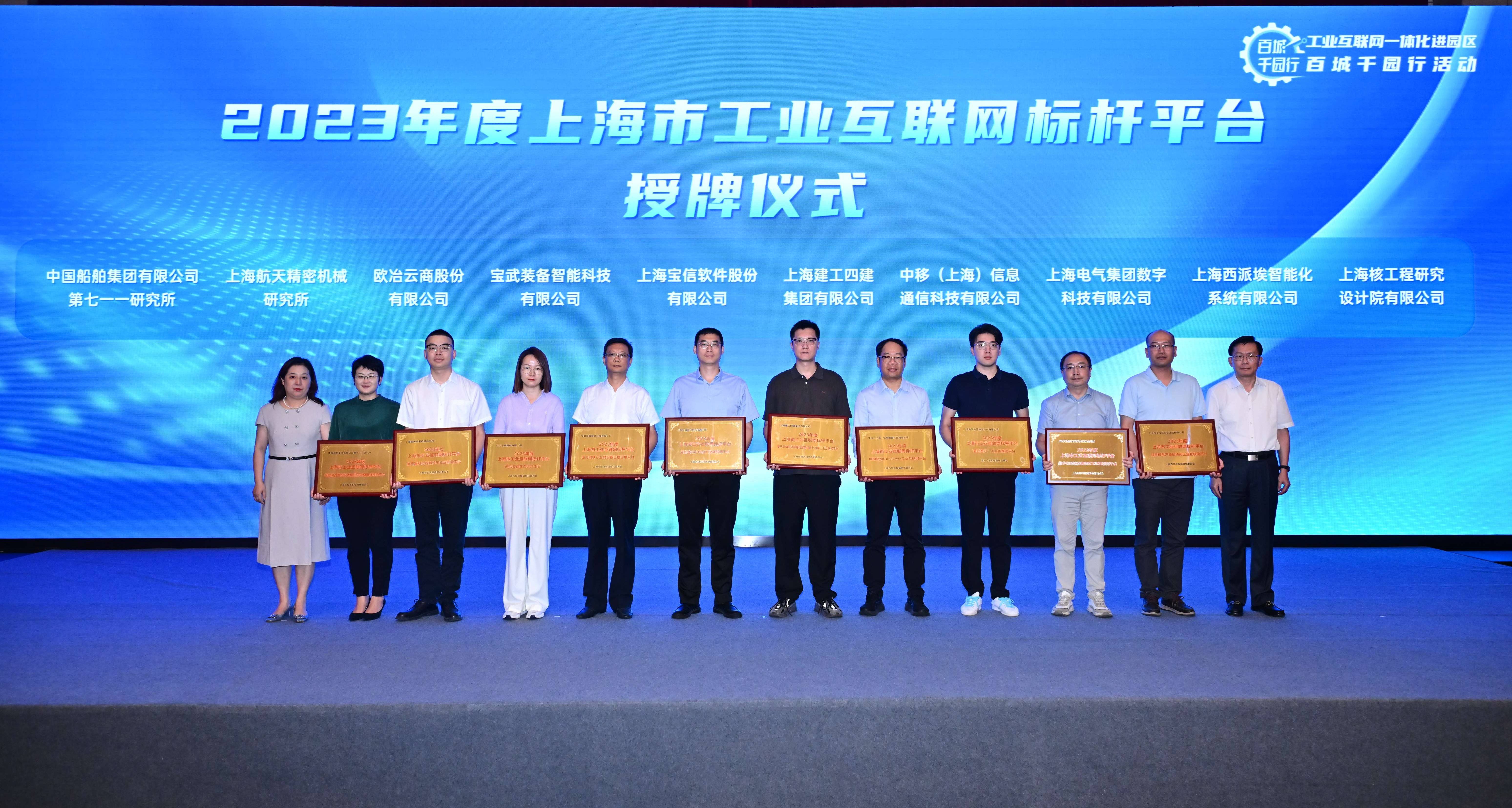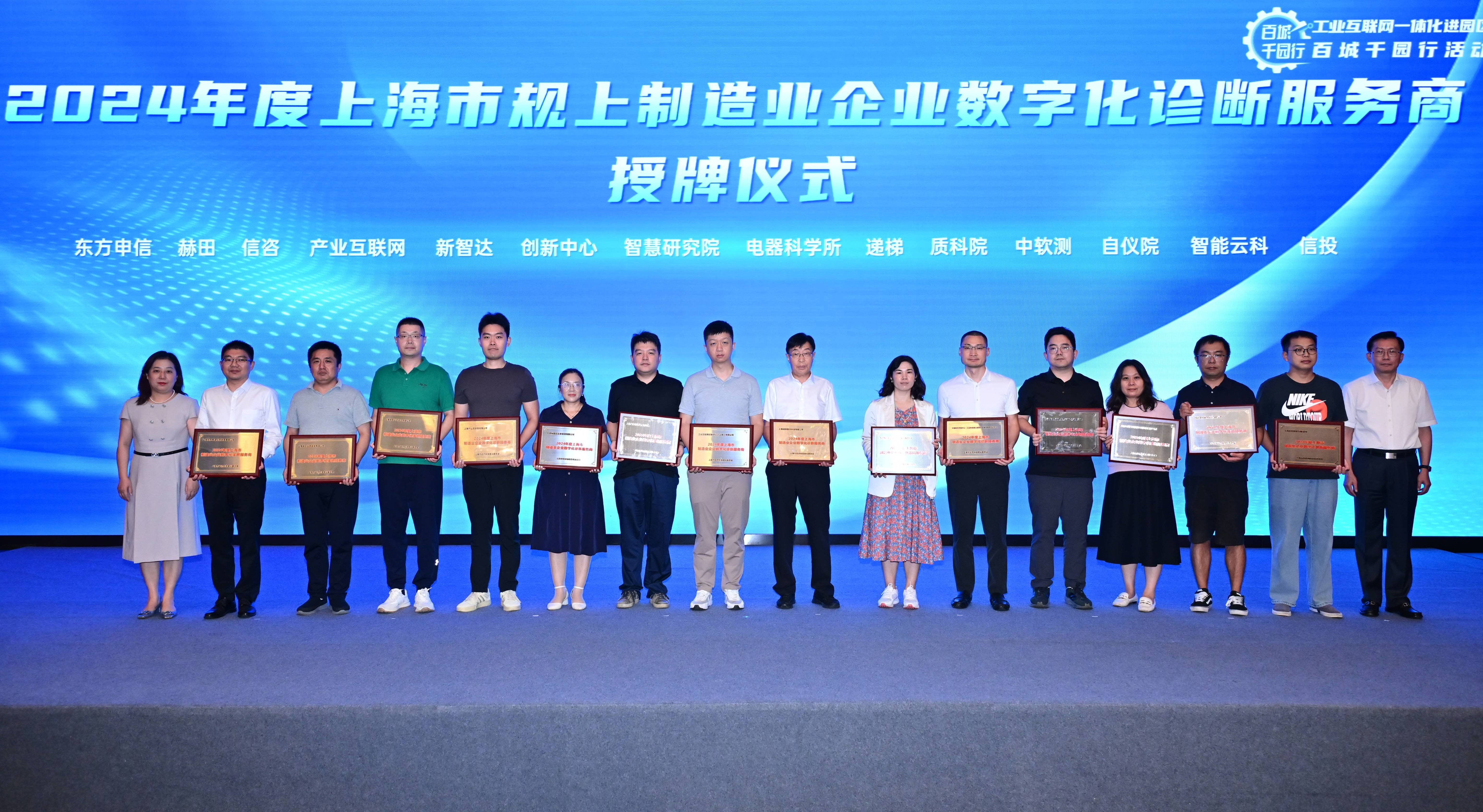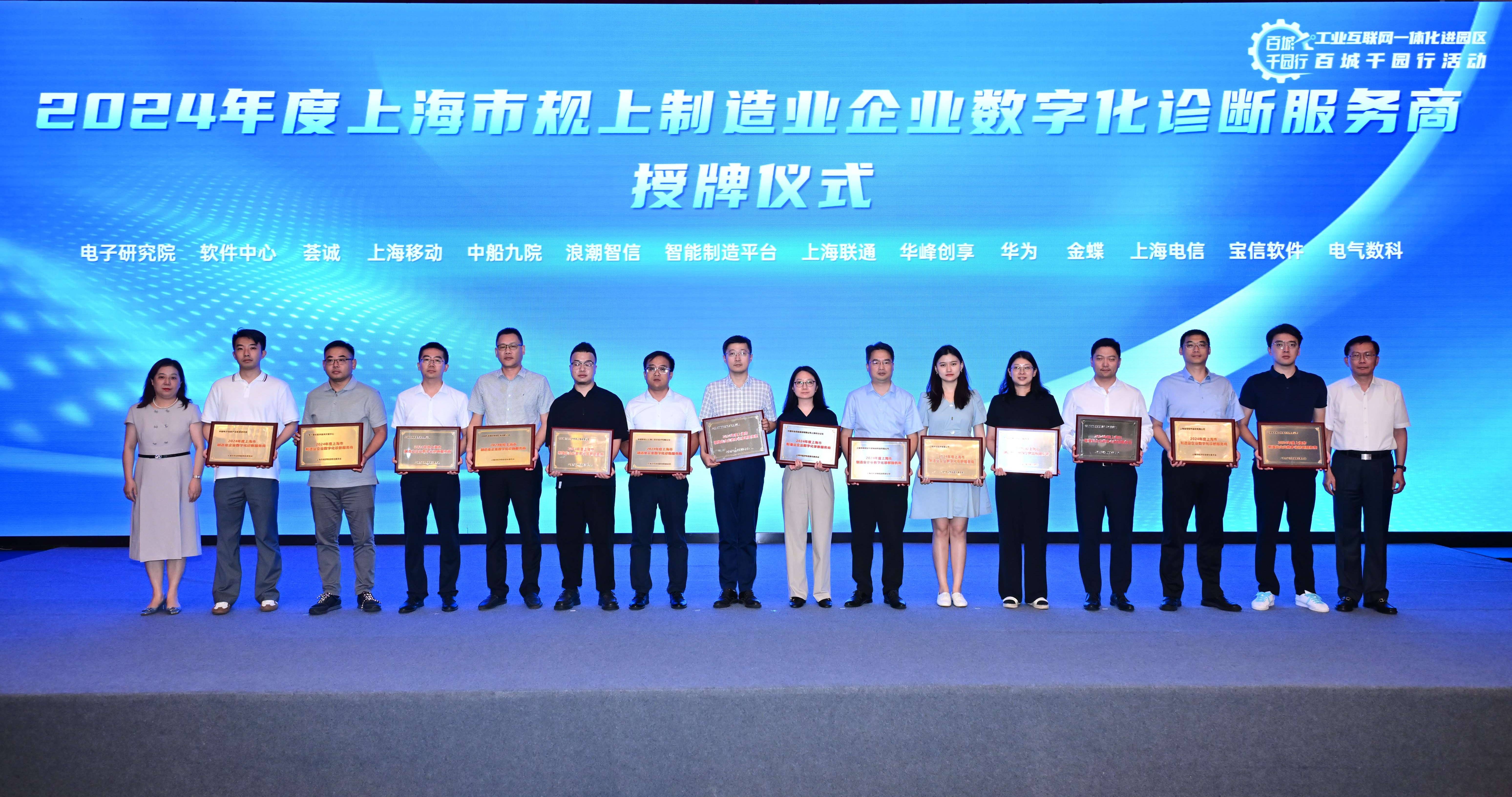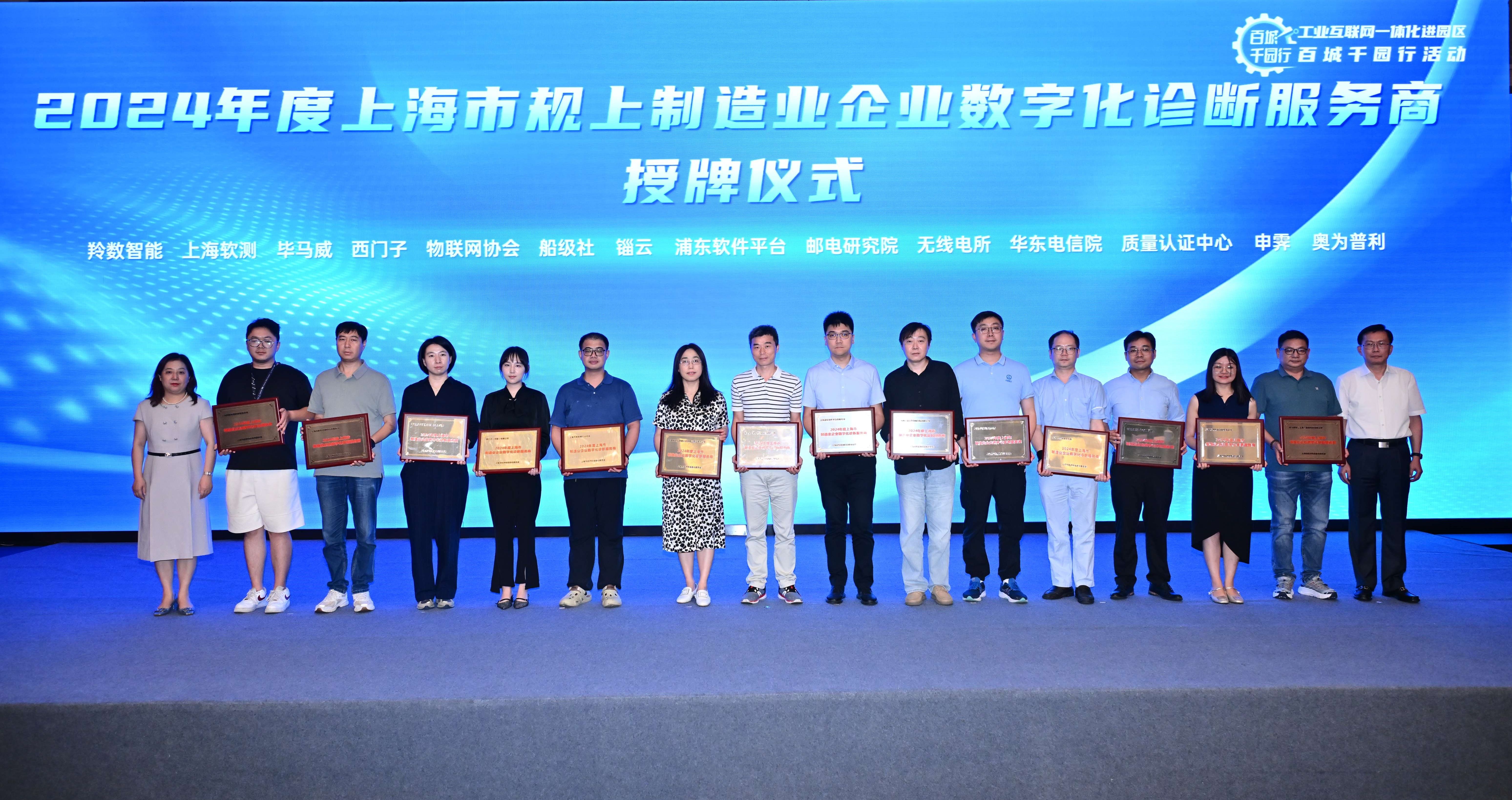 会上,市经信委总工程师裘薇、市工业互联网协会会长张锡平为10家2023年度上海市工业互联网标杆平台和42家2024年度上海市规上制造企业数字化诊断服务商授牌。